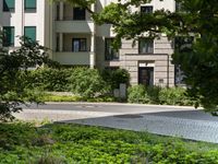 A residential area in Berlin, Germany seen on a clear day. The modern architecture of the homes and buildings contrast against the vegetation, public spaces, and infrastructure such as manhole covers and asphalt roads. The shadows and sunlight create an interesting contrast to the urban design.
