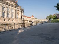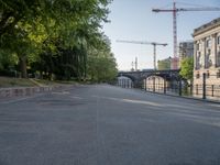 A view of a busy street in Berlin, Germany, with a classic architecture facade, asphalt road, street light, and vegetation lining the sidewalk. The symmetrical houses, electric poles and jetty along the canal provide a peaceful atmosphere.