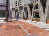 A modern urban design in California, USA. The city streets are filled with shops and restaurants, offering a vibrant city life experience. One quarter of the surface is covered with pavers, providing a sleek and contemporary look during the day. Enjoy eating out at the various restaurant storefronts.