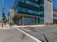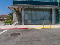 A view of a modern office building and business district in the city, with clear sky and asphalt road in California, USA.