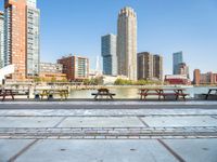 A high-rise building, street light, and vegetation in the Netherlands, Europe. A cafe and pier along the river, with a clear sky and modern architecture in the background. A boat on the lake with the public space and skyline in the background.