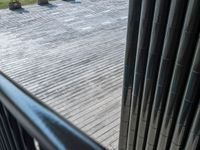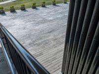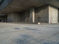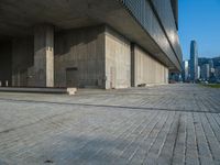 A view of a modern office building in the bustling business district of Hong Kong, with clear skies and a straight road leading to various shops and storefronts. The elevated position offers a top-down perspective of the city, highlighting its urban design and open spaces. The hard shadows cast by the high-rise buildings create a striking profile.