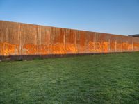 A metal graffiti wall in a park in Berlin, Germany, with clear sky and a hard shadow of a nearby river in the break of day. The greenery and urban design of the city make it an ideal destination for recreation and art.