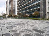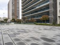 A view of the bustling business district of Lisbon, Portugal, featuring high-rise buildings, modern architecture, urban design, and botanical elements like grass, trees, and flowers.