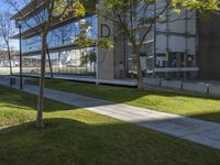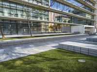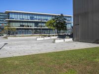 A view of the modern architecture, urban design, and composite materials of Lisbon, Portugal. The scene features a sunny day with a clear sky, grass surface, and a hard shadow cast by a high-rise office building. The yellow curb and paver line the road, and the open space is filled with vegetation, trees, and buildings.