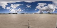 A dry river runs through a city in California, USA, with a yellow factory and a parking deck in the background. A monoplane and helicopter fly in the cumulus atmosphere while a model aircraft performs aerobatics at an air show. Urban design, industrial surfaces, and a concrete dam are all part of the urban landscape.