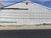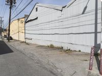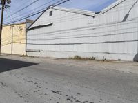 A view of classic architecture and urban design in Los Angeles, California, USA. The scene features a road surface, asphalt, residential area, buildings, houses, parking lot, overhead power line, metal wall, fence, land lot, loading dock, art district, cloud, facade, roof, siding, profile, curb, tree, and a clear sky with contrails.
