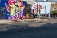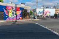 A vibrant urban scene in the art district of Los Angeles, showcasing a colorful graffiti wall and storefronts on a sunny day