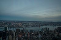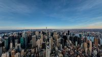 A view of the Manhattan skyline at the break of day, with modern skyscrapers, urban open spaces, and contrails in the sky dome, in New York City, USA.
