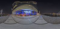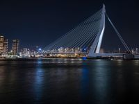 The city of Holland is illuminated by artificial light after midnight, with the cityscape featuring tall high-rises and modern architecture, along with the cable-stayed and suspension bridges of the river, pier, and harbor. Water resources such as lakes and rivers are featured in the horizon, with a bright dawn on the horizon.