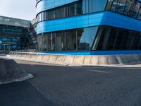 A view of a metropolitan area in Holland, Europe, featuring modern architecture with condominiums, office buildings, and glass windows with tints and shades, as well as a high-rise building, asphalt road surface, and a curb with stairs.