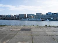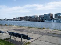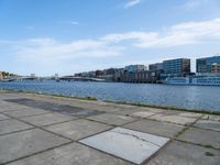 A sunny day reveals the modern architecture and urban design of the city, with a pier and boat on the river, lake, and harbor. The high-rise buildings, vegetation, and street furniture provide a view of the coastal cityscape against a clear sky.