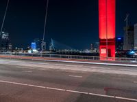 A modern urban landscape in Holland featuring a cityscape illuminated by electric lights, a suspension bridge, cable-stayed bridge, skyscrapers, a thoroughfare, and a high-rise tower on a midnight road, with a line of street lights in the foreground, and light streaks in motion blur.