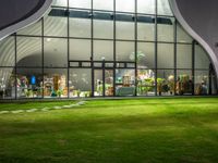 A cityscape of Taichung, Taiwan during break of day, with modern architecture, artificial light, asphalt road, concrete surface, grass surface, open space, plaza, shop storefronts, and street lights reflecting in the clear sky.
