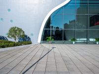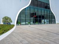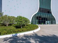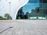 A modern urban design with a paver surface, storefronts, theater, open space, and grass in the Republic of China's city of Taichung. The sun casts hard shadows straight down the road, providing a profile of city life in the day.