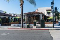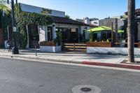A view of a residential area in the city with a clear sky overhead. The road surface is made of a composite material, and has vegetation, asphalt, a curb, and a gas line running along the side. The facade of the building has an interesting urban design, with windows, trees, and shade adding to the overall picture.