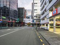 the empty street with buildings and a fire hydrant on one side and a stoplight on the other side