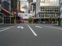 two arrows on a street with buildings in the background, and an empty street that is marked red, at one point
