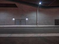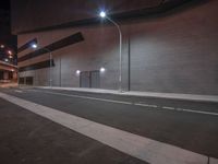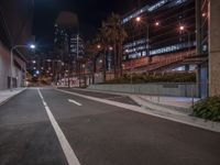 A view of a city street at night with illuminated buildings and street lights.