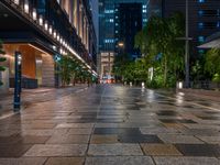 The city of Tokyo, Nihonbashi, illuminated at night by the artificial light of office buildings, street lights, and cars. The wet pavement reflects the light, giving the city a unique urban design.