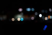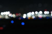 A vibrant cityscape at night, illuminated by neon lights and artificial flare, creating a mesmerizing display of blue and purple hues.