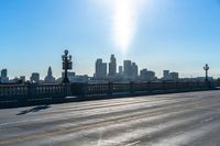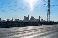 The modern skyline of Los Angeles, California, USA is illuminated by the sun, featuring bridges, electric lines, asphalt roads, tall buildings, trees and a lake in the foreground.