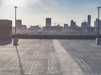 The sprawling city of Los Angeles, California, USA is a mix of modern architecture, cityscapes, and concrete streets, with the occasional patch of green, all punctuated by sun and clear skies. This image captures the tints and shades of grey in the asphalt parking lot, the high-rise residential area, and the composite material of the parking garage. The horizon is dotted with skyscrapers and towers, with a few clouds in the distance.