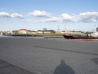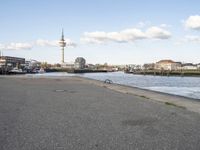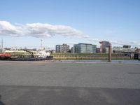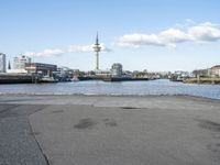 A view of the city of Bremerhafen in Europe, nestled between a lake, a harbor, and a pier. Rolling tar and concrete roads lead to the waterfront, while high-rise buildings and skyscrapers line the horizon. A boat is seen in the harbor, and a clear sky frames the day.