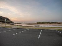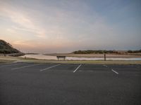 A scenic view of a city road at dawn, with the sun rising over the horizon and casting a warm glow on the asphalt surface.