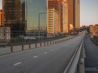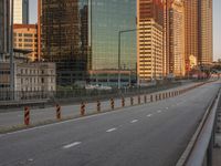 A stunning view of modern architecture and city skyscrapers at dawn, with clear skies and a lighted road surface.