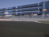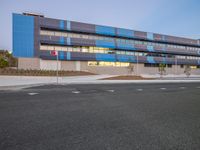 an empty road in front of a large modern building at twilight, with a blue stripe on the side