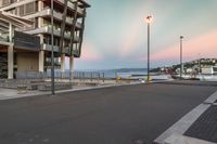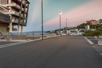 A stunning view of a city at dawn with beautiful architecture and a coastal area.