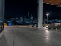 A stunning view of a city at night, with low coastal buildings and a beautiful coastline. The water reflects the artificial lights from the high-rise buildings, creating a mesmerizing symmetrical pattern. The city's infrastructure, roads, and street lights add to the urban design, while the clear sky and concrete surfaces provide a striking contrast. The harbor and public spaces, including a bench, offer a peaceful atmosphere amidst the bustling city life.