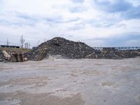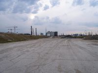 A view of the bustling cityscape of Germany with its factories, roads and buildings, with a coastal lake and a horizon of cumulus clouds in the background.