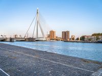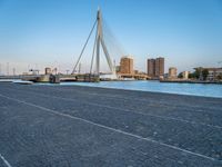 A sailboat with a mast is pictured in the harbor of a city in the Netherlands, as the sun rises in the horizon. The cityscape features modern architecture, urban design, and infrastructure, with roads, bridges, and buildings illuminated by the early morning sunlight.