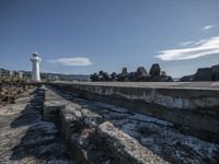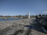 A stunning view of a cityscape with a lighthouse and tower in the foreground, set against a backdrop of azure sky and a scenic coastal landscape.