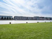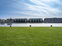 an empty park with the water in front of some buildings and a green field under a blue sky