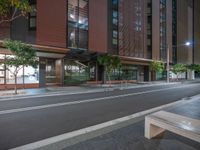 A view of a city at night with illuminated office buildings, streetlights, and road surface.