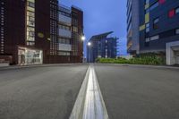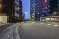 A view of a city at night with tall skyscrapers and illuminated office buildings, creating a vibrant urban scene.