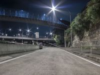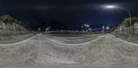 A view of a city at night with street lights illuminating the road surface and a clear sky above