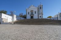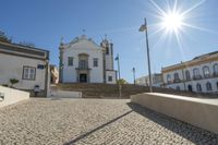 A beautiful example of classic architecture, the Church of Matriz de Estoi in Portugal. This historical church is located in the charming European town of Estoi, known for its cobblestone streets and stunning cityscape. The church's facade is a prominent feature in this residential area, surrounded by open spaces and sunny skies. A perfect destination for tourists seeking a peaceful vacation and a glimpse of city life in Europe.