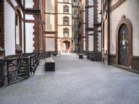 A classic brick building with symmetrical facade, industrial road surface and metal fixtures, in the heart of a bustling urban neighborhood in Hamburg, Germany, Europe.