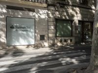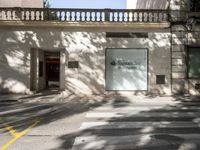 A beautiful classic architecture building in Mallorca, Spain, surrounded by a vibrant neighborhood. The sun casts a shadow on the facade, highlighting its intricate details. The monochrome color scheme adds a touch of timeless elegance to the scene.