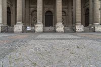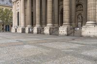 The cobblestone road and facade of a classic architecture in Paris, France, with a tree in the plaza and a beige paver floor. The grey sky gives a gloomy feel to the urban design yet the open space and town square still let city life thrive.