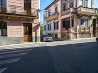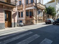 a cross walk on a busy residential street in europe, with buildings behind it and cars parked outside of the building