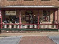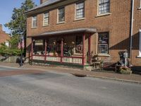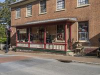 a small red brick store front on a street corner with benches and benches in the sidewalk