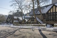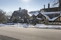 houses in the snow on a city street with trees on either side of them and a car passing by