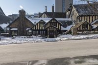 an old building that has been snowed out on a snowy day, on the side of a street