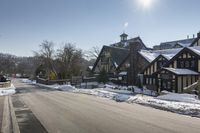 a road with several houses and no vehicles in the middle of it with some snow on the ground