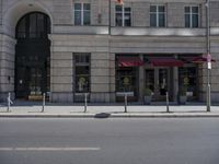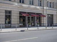A daytime view of a bustling mixed-use neighborhood in Berlin, Germany, with classic architecture and storefronts, contemporary buildings, and urban transport along the roads and lanes.